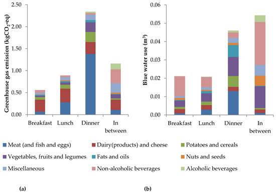 (a) Average greenhouse gas emission in kg CO2-equivalents and (b) average blue water use in m3 by consumption moment of 4313 Dutch children and adults derived from the Dutch National Food Consumption Survey 2012–2016, weighted for demographic properties, season, and combination of both consumption days.