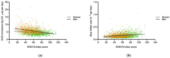 DHD15 scores (maximum 140) showed that women had a significantly higher adherence to DHD15 with 64 ± 24 points (mean ± SD) compared to men with 52 ± 22 points (mean ± SD) (Table 3). On 9 out of 14 components (fruit, nuts, tea, red meat, processed meat, sweetened beverages and fruit juices, alcohol, and sodium) women scored significantly higher compared to men. The DHD15 score was significantly inversely (p < 0.0001) correlated with GHG emissions and significantly positively correlated with blue water use (Figure 2a,b).