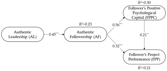 This study proposes that leaders and followers in university team projects should have authentic leadership (AL) themselves in order to improve the overall performance of the team project. While previous studies have focused mainly on achieving performance through AL on the firm level, this study endeavored to examine the relationship between university students who are expected to serve in an organization’s human resources department in the future and followers’ project performance (FPP). This study also considers both followers’ positive psychological capital (FPPC) and their authentic followership (AF), which can be affected by the degree of AL. In order to verify the hypotheses, we adopted a partial least square-structural equation model (PLS-SEM) with 175 samples of valid data from two universities in South Korea. Results showed that all four hypotheses, including the direct and indirect effects, were significantly corroborated. In compliance with these results, this study suggests that a leader’s AL should be a prerequisite to improve FPP. Furthermore, this study establishes the importance of FPPC through the fact that when a leader is authentic, FPPC and FPP can be cultivated. Having compared our findings with previous research, we predict that if students develop AL at university before becoming part of an organization, they will contribute to the performance of the university as well as to attaining the organization’s sustainable performance as a member.