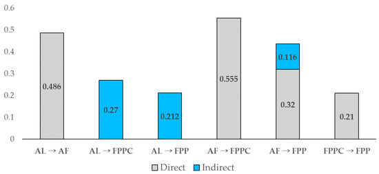 This study presents Figure 3 to compare direct and indirect effects graphically. Looking at the direct effects, the direct effect of AF on FPPC was the highest (0.555), and the direct effect between AL and AF was the next highest (0.486). The direct effect between AF and FPP was not somewhat high (0.32), but the indirect effect was quite high (0.116). Among the indirect effects, the effect of AL on FPPC was the highest (0.27), followed by the effect of AL on FPP (0.212).
