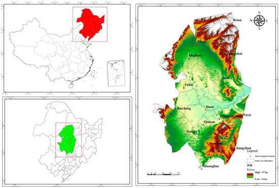 Songnen grassland is taken up as case study, which is drought vulnerability area in northeastern China. Songnen grassland is located between 43°30′–48°05′N latitudes and 122°12′–126°20′E longitude with 10.32 million km2 area. The location map of the study area and meteorological stations are given in Figure 1. It is surrounded by mountains on three sides, i.e., the Da Hinggan Mountains in the West, the Yilehuli Mountain and Xiaoxing ‘an mountain in the North, Hangguangcai mountains in East, Songliao rivers watershed in the South. It is alluvial plains formed with Songhua River, Nenjiang and Taoer River and Huolinhe River. The elevation is 150–250m above. Songnen grassland is a main part of the northeast China plain, which is among China’s three Great Plains. Songnen grassland in northeastern China has arid climate condition with annual mean precipitation of 350–500mm and drought degree reached 1.1–1.5. The annual evaporation in this area is 2–3 times more than annual precipitation. In addition, the precipitation in this area is not only low but also uncertain. Due to the lack of precipitation, this region faces frequent severe droughts.