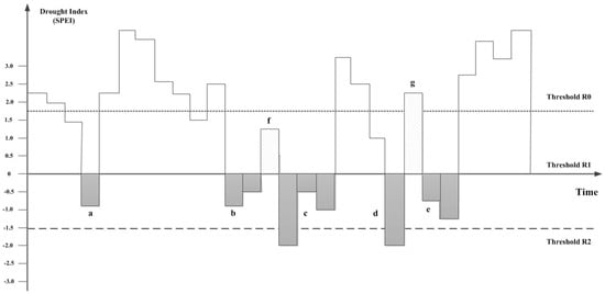 In this paper, we identify the grassland drought event based on the run theory during growing season from April to September, assuming the SPEI index threshold R0, R1 and R2. The process of the identification of drought events is shown in Figure 2 and the identification step of the drought event is as follows. Firstly: preliminary judgment of the drought events. The SPEI consequence was divided by the threshold value R1. When the SPEI value is less than R1, the preliminary judgment for this period of drought is a, b, c, d and e. Secondly: handling small drought events. According to the first step preliminary result, we can filter the small drought events based on the threshold value R2. The drought event last only one unit time (such as a, d), and the SPEI value is lower than the threshold value R2 (such as a), we defined this drought event as a small drought event and ignored in this study. For a drought event with an SPEI value that is less than R2 (such as d), it is regarded as one drought event. Finally, merging drought events. The interval time last only one month between several drought events (such as b and c, d and e) and the SPEI value is more than R0 (such as f), we can combine these two drought events into one drought event. If the SPEI value (such as g) is greater than R0, we can consider them independent drought events (such as d, e). Therefore, we identify 3 scales of drought events according the above steps as shown in Figure 2.