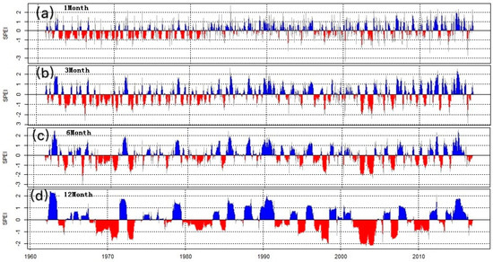The different time scale SPEI of Qian’an station (1960–2014). (a) 1 month time scale(SPEI-1); (b) 3 month time scale(SPEI-3); (c) 6 month time scale (SPEI-6); (d) 12 month time scale(SPEI-12).