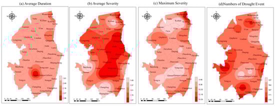 Spatial distributions of (a) average duration, (b) average severity, (c) maximum severity, and (d) number of drought events.