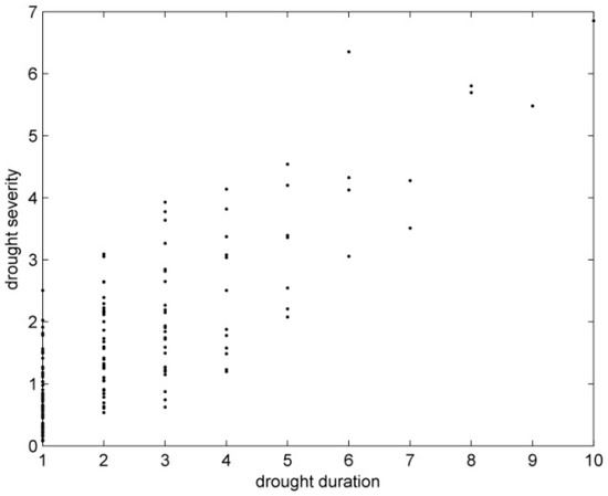 By calculating the Spearman’s rank correlation coefficient, with details in ref [49], of drought duration and drought severity, we found that there is a strong correlated relationship for 15 meteorological stations in the period 1960–2014 in Songnen grassland in northeastern China. The correlation coefficient between drought duration and drought severity is 0.7584–0.6505, among them, the Mingshui station has the highest correlation, which is 0.7584, and Qianguo station has the lowest correlation coefficient, which is 0.6505. The scatter distribution of the drought duration and drought severity of Qian’an station is shown in Figure 5.