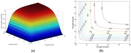 Because different copula functions represent different related association structures, and the choice of the copula function will directly affect the result of the analysis and statistical inference, therefore, choosing the best copula function is a very important task in our study. In this paper, we selected Clayton, Frank and Gumbel–Hougaard copula as optimal copulas for determining the joint distribution of drought duration and drought severity at all the meteorological stations. We used Kendall’s tau coefficient to measure the association between drought duration and drought severity. The parameters are used to the observe copula distributions due to confirming the best-fitted bivariate copula family and to imitate the dependency between drought duration and severity. The results for Kendall’s tau coefficient and parameter estimation for the 15 stations in Songnen grassland in northeastern China are shown in Table 3. Furthermore, the copula families are determined by the RMSE and AIC (Table 3). As shown in Table 3, it is obvious that the Frank copula distribution produces minimum error and the lowest value of RMSE and AIC, which indicates that the Frank copula is the best-fitted joint distribution of drought duration and drought severity. Figure 6a,b illustrates the surface plot and contour lines of the joint cumulative probability for drought duration and drought severity using the Frank copula respectively. According to the above analysis, we used the Frank copula function to link the marginal distribution functions, gamma distribution and GEV distribution, which can effectively describe the relevant joint distribution of drought duration and drought severity for Songnen grassland in northeastern China.