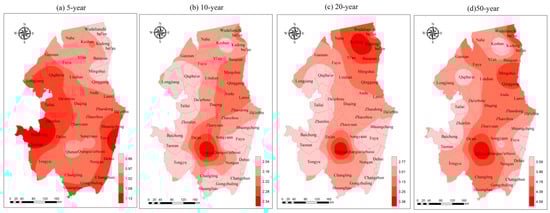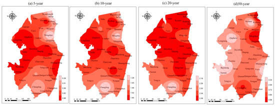 In this study, the two variables of drought duration and drought severity describe the drought characteristics. Drought events with long duration and large severity have a serious effect on Songnen grassland. The spatial distributions of the drought duration and drought severity of different drought events corresponding to a return period of 5, 10, 20 and 50 years in Songnen grassland are shown in Figure 7 and Figure 8, respectively.