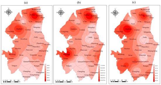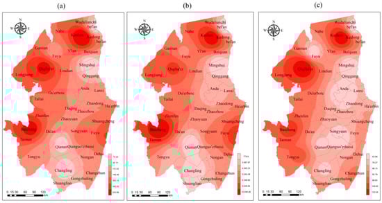 The spatial pattern of the return periods including secondary return periods of a drought duration of 9 months related to a higher drought severity of 7.5 of Songnen grassland in northeastern China for the second scenario is shown in Figure 10a–c. Similar features for the spatial pattern of the return periods of droughts related with longer durations and higher severities across Songnen Grassland in northeastern China can be identified. It can be seen from Figure 10a,c that two similar high-risk regions of drought characterized by drought duration of 9 months with drought a severity of 7.5 can be found in Keshan county, Longjiang county and in Qiqiha’er city. However, the area of high-risk regions located in Qiqiha’er city in the secondary return period of "or” was greater than the joint return period. A lower drought risk can be seen in Bei’an county, northeast of Gannan county and west of Nahe city, and Changling county, Shuangliao city and also in Mingshui county.