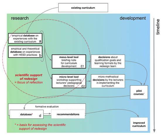 We report and critically reflect on a curricular-redesign process we have supported and accompanied as scholars in the sense of an HESD-specific learning and improvement process. This paper is a theory-based and data-supported reflection on this process and can thus best be characterized as action research rather than as a case study in a strict sense. Following the rationale of action research, the paper describes the iterative shift between research (i.e., surveys, analysis, evaluation) and development (i.e., deciding on action consequences) [30,31] in the curricular-redesign process of a study program.