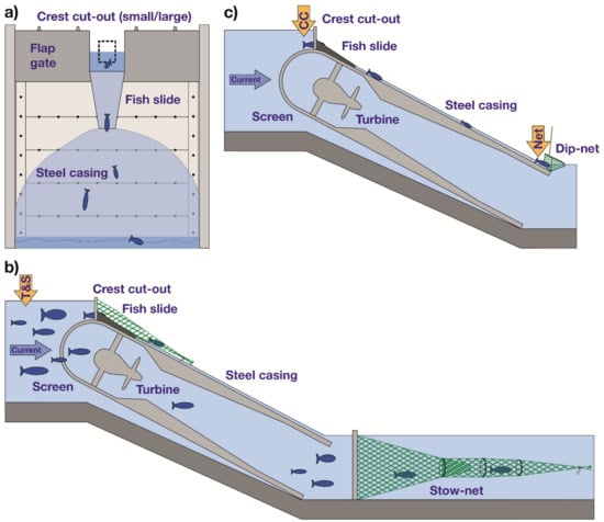 - Pander, J.; Mueller, M.; Knott, J.; Geist, J. Catch-related fish injury and catch efficiency of stow-net-based fish recovery installations for fish-monitoring at hydropower plants. Fish. Manag. Ecol. 2018, 25, 31–43. [Google Scholar] [CrossRef]
