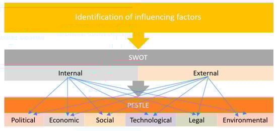 Given the complex and multidimensional environment in which ports operate, the synergy between SWOT and PESTLE analysis offers the potential for analyzing the development of a port energy management system in relation to its internal and external environment. As proposed by Vorthman [29] and Srdjevic et al. [28], SWOT analysis is used within this study for dividing the factors that play a vital role in the successful development of a Port Energy Management System (PEMS) into two clusters—internal and external—according to the domain of their influence on the system. These factors are then further analyzed and clustered into six categories—Political, Economic, Social, Technological, Legal and Environmental—according to the type of their influence on the system through a PESTLE analysis (Figure 1).