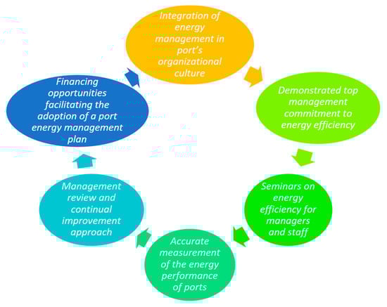 - Management review and continuous improvement approach. The continuous improvement of the energy performance of ports can only be achieved through periodic management review. Based on the results from the adoption of the energy efficiency measures and their comparison with the required energy objectives, new energy objectives could be set targeting greater reductions in the port’s energy consumption. These results are similar to those obtained by the implementation of SEEMP in vessels and indicate that effective energy management planning should include stricter requirements, like those proposed by the ISO 50001 standard [44].