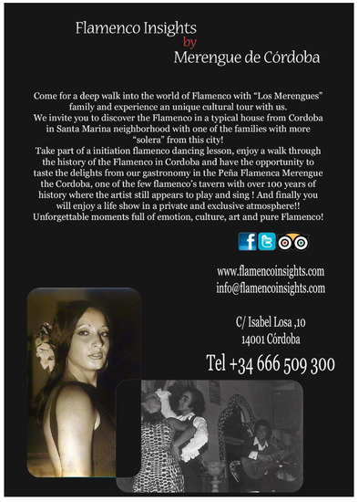 - Guía Cultural del Flamenco de Córdoba. Agenda. Available online: https://cordobaflamenca.com/agenda/ (accessed on 10 October 2019).