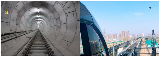 A track structure comparison of a metro system and an Elevated Electromagnetic Suspension (EMS) Maglev system: (a) a typical rail-track structure of a traditional metro system []; (b) EMS Maglev track structure of the Beijing Maglev Express.