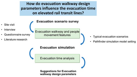 Therefore, the objective of this study is to find the combined effect of the entrance width and walkway width of an evacuation walkway on evacuation time and then to put forward a suggestion as to a potentially better design combination, which may result in a shorter evacuation time. The study flow and its corresponding contribution are as follows: