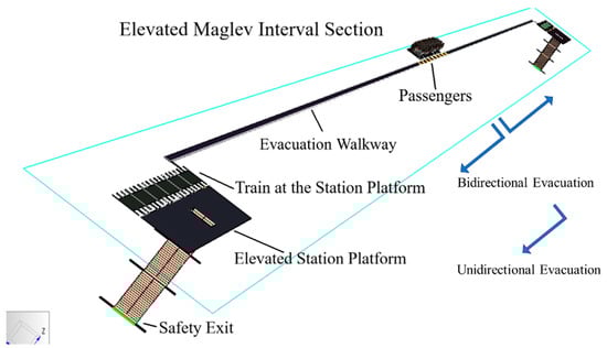 A train is forced to stop at an elevated interval. The passengers must alight from the carriages, enter the evacuation walkway and evacuate along the walkway, until they reach the safety exits at the stations. The evacuation starts from the middle point of the interval, which is at the longest walking distance from both of the two nearest stations. Two scenarios are considered in the simulation, a unidirectional and bidirectional scenario, in which the passengers can evacuate with only one safety exit (the left one) or two safety exits, respectively. It is assumed that no working staff organized and coordinated the evacuation. The evacuation scenario is shown in Figure 3.