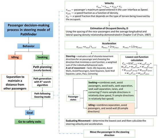The steering mode of Pathfinder was chosen to simulate passenger movement. The steering mode is an agent-based model which is following Reynold’s steering behaviour model [] and refined by Amor et al. []. The passengers were set as an autonomous agent with different characteristics such as age, moving speed and pre-movement time []. In the steering mode, Pathfinder uses a combination of steering and collision handling mechanisms to control how the passengers achieve their goal in an emergency situation. These mechanisms allow the passengers to move along their path, deviate from the obstructions (interact with the environment and the other passengers) and still head in the correct direction toward their goal, the safety exits []. The algorithms and decision-making process when passengers follow the steering mode have been summarised in Figure 4, and the calculation process can be found in the technical reference of Pathfinder [].