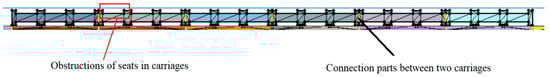 In Pathfinder, the construction environment of the elevated rail transit lines can be represented with a 3D geometry mode, i.e., evacuation walkway, station platform and stairs at different layers []. A navigation mesh is defined as a continuous 2D triangulated surface within a 3D geomtry model (see Figure 5). Passengers’ motion takes place on this navigation mesh. The obstruction of seats in the train is implicitly represented as gaps in the navigation mesh. Since the passengers can only travel on the navigation mesh, this technique prevents the overhead of any solid object representation from affecting the simulation.