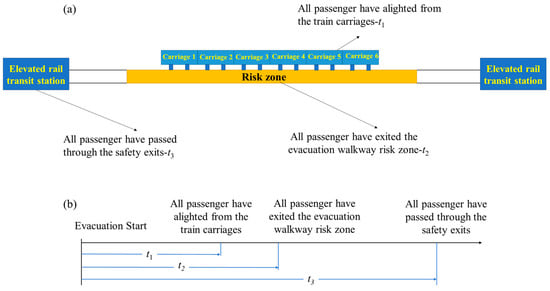 During an interval evacuation, passengers have to transfer from the train carriages to the evacuation walkway as quickly as possible and walk for a long distance, until they reach the safety exits at the stations. The passengers have different safety risks according to their various positions on the evacuation walkway. For example, in the case of a fire breakout in a Maglev train, passengers are at a higher risk if they are closer to the train carriages compared to the passengers who have already evacuated to the risk zone and those who are already outside of the risk zone [,]. Jumping fire and toxic gases have a higher tendency to harm those who are closer to the train compared to those who are further away from the train []. In addition, passengers are often more at risk of stampede when they are in the congested connection part between the Maglev train and the evacuation walkway. Hence, it is crucial to shorten the evacuation time for passengers, especially in leaving the train and the evacuation walkway risk zone during the evacuation. Measuring the evacuation time of different stages in an evacuation process might be helpful for improving the evacuation walkway design. Therefore, based on the evacuation scenario survey, a new measurement of evacuation time is proposed, which is as follows: