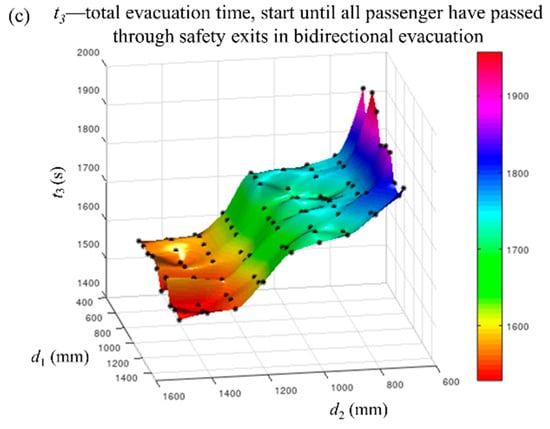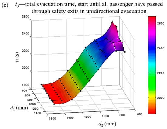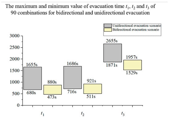 The maximum and minimum values of t1, t2 and t3 of 90 combinations for bidirectional and unidirectional evacuation are illustrated in Figure 7. It can be seen that unidirectional evacuation took longer than bidirectional evacuation. This is to be expected, because in unidirectional evacuation, the passengers had only one possible exit. Additionally, altering the combinations of the evacuation walkway design parameters, d1 and d2 resulted in a broader difference between the maximum value and minimum value of t1, t2 and t3 in unidirectional evacuation, compared with bidirectional evacuation.