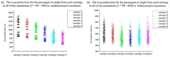 The evacuation time for carriages, i.e., for all the passengers to get away from each carriage was also a noticeable point. The evacuation time for the passengers to alight from each carriage in all of the simulations (5 × 90 = 450), in both unidirectional and bidirectional evacuations, is shown in the scatter diagram in Figure 8.