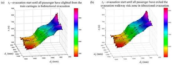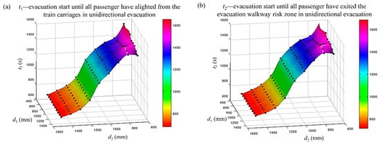 The evacuation time for each carriage for 90 combinations of d1 and d2. (a) Unidirectional evacuation and (b) bidirectional evacuation.