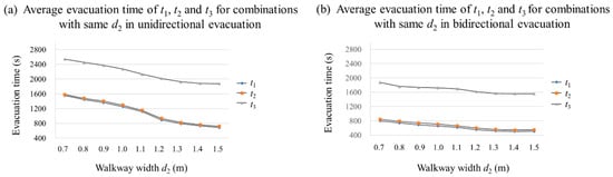 To quantify the combined effect, the average evacuation time of t1, t2 and t3 with the same d2 in both evacuation scenarios was calculated (see Figure 11). It can be observed that when d2 is increased from 0.7 m to 1.5 m, the average evacuation time of t1, t2 and t3 was reduced by 55.9%, 54.5% and 26.2%, respectively, in unidirectional evacuation, and 36.3%, 35.2% and 17.0%, respectively, in bidirectional evacuation. An increase in the walkway width, d2, resulted in a more significant reduction of the evacuation time in unidirectional evacuation than in bidirectional evacuation.