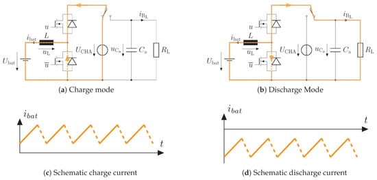 In this paper, a reasonable compromise is found: Using the widely known half bridge converter as shown for example in [18] at low voltage as a foundation to cycle single cells is still a practical approach that is cheap, scalable and does not have to deal with high voltage and severe noise. Figure 1 shows the basic working principle of the circuit. The battery is located at the low side and is connected directly to the smoothing inductance. At the high-side a 12 V voltage source or a resistive load with a smoothing capacitor are connected to the circuit with a simple switch, depending on whether the the battery is charged or discharged, respectively. Low- and high-side are interconnected with field-effect transistors (FET) and their internal body diodes. In Figure 1a,b, the current flow is given, depending on the operation mode. Assuming lossless and ideally fast switches, an ideal inductor, that is a constant voltage source, that and are approximately constant or rather their time constants are large compared to the switching frequency the differential equation