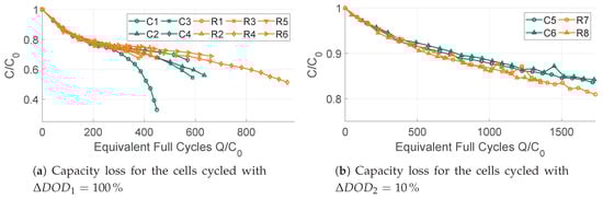 The aforementioned grouping is also visible for , as seen in Figure 4b. In opposition to the fully cycled cells, R7 and R8 age a bit faster than the conventionally aged reference cells C5 and C6. Moreover, the contradictory observation between Figure 4b and Figure 5 cannot be explained satisfactorily in another way than statistical spread. It is assumed, that an absence of the unexpected early failure of cells R2, R3 and R5 would have led to a more similar trend of the mean values. Moreover, the uncertainty of the statistical approach rises as the number of analysed cells diminish. Therefore, the analysis of the capacity loss leads to the assumption that the effect of a deep cycle depth greatly outmatches the influence of current ripple whereas the influence of current ripple could be visible for the partially cycled cells instead.
