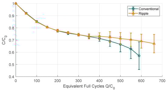 The capacity diminution is seen as one of the most important parameters to define ageing as it is directly connected to electric vehicle range or the amount of time a storage system can operate. Accordingly, the capacity fade is also referred to as the ’state of health’ (SOH) such as in e.g., [20,25] so that the remaining capacity is directly linked to the remaining usability of the battery in practical applications. In Figure 4, the capacity evolution for each tested cell is depicted. The Figure 4a represents the cells that have been cycled with = 100% whereas Figure 4b shows the evolution of the capacity for the cells with a much lower of 10%. To reduce the business of Figure 4a due to the higher amount of tested cells, the same measurements are shown in Figure 5 as mean values with errorbars, that represent the upper and lower bounds of confidence intervals for a probability of 95%. It should be noted that the markers in Figure 5 are arbitrarily set at every fifty equivalent full cycles as the results have been interpolated to make the statistical analysis possible. Besides, the suddenly increasing slope of the ripple current graph in Figure 5 comes from premature cell failure of R2, R3 and R5 as indicated in Figure 4a. Throughout all tests a major similarity can be noted: The capacity drops quite steeply in the beginning of the tests. Interestingly, the capacity depletion of the cells cycled with slows down at roughly which is a common reference point for the transition between linear and nonlinear ageing [24,26]. Later on, the typical spread between faster and severely faster aged cells as reported in [27] is observable. Furthermore, it becomes visible in the last part of the graph that the rippled cells and the conventionally aged cells are grouped respectively which is easier to distinguish in Figure 5. At the same time, the upper and lower error bounds become much larger. However, this grouping should not be over-interpreted as it only occurs at late stages of battery life beyond a of approximately 70% and is expected to be linked to premature cell failures (see above) and the volatile region of nonlinear battery ageing that could also be due to statistical spread induced by production tolerance as investigated in [27].