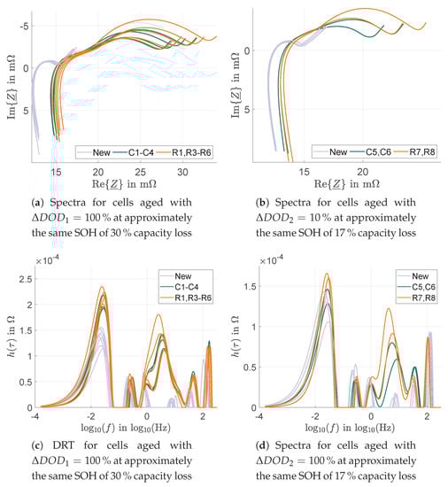 This impedance can be used to derive a dynamical model of the measured cell or to analyse ageing effects as the behaviour of the impedance is directly linked to corresponding characteristics of the cell such as the electrode reactions or diffusion. The trend of the impedance is normally visualised as a Nyquist plot in the complex plane. This visualisation can be seen in Figure 7a,b in the same way as the results for the DVA are presented in Figure 6, i.e., at the same SOH to minimize unwanted discrepancies between the groups of cells because of different capacity losses. A picture that shows the spectra at is omitted as it does not supply any further information compared to the impedance spectra shown at a capacity loss of . The shown frequency range is since high frequency parts above do not show any distinguishable differences between the aged cells. Moreover, the inductive reactance rises significantly at higher frequencies so that this area has been also cut due to better visibility of the capacitive area. Furthermore, general statements about the alteration of the spectrum because of cyclic ageing are neglected again to keep the focus on the comparison. As expected, the intersection of the real axis, often referred to as the inner resistance , e.g., in [30], rises as the cells age. It should be noted that the spread between the initial intersections has been equalised in Figure 7a,b to improve comparability. Taking this into account, a further grouping is visible as most inner resistances of the rippled cells have grown slightly larger compared to the conventionally aged cells. More information is gathered, if the polarisation of the electrodes is taken into account. Considering the new cells, the representation of the electrodes cannot be distinguished. This changes as the batteries age since both flattened semicircles separate from each other and become wider. Except for one rippled cell in each group, i.e., R6 and R8, no clear differentiation between the rippled and the conventionally aged cells is observed. Moreover, it is challenging to derive the most prominent time constants that cause the spectra at hand, yet this valuable information is a nominal asset to compare rippled and non-rippled cells even further.