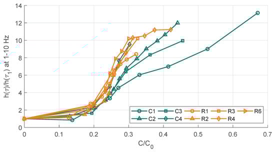 Another approach to visualise the information given in the impedance data is shown in Figure 8. In this picture, the normalised height of the largest peak in the middle of the DRT, representing the polarisation of the anode, is plotted against the capacity loss as shown in Figure 4a for cells cycled with . A slight grouping just as in Figure 4a is detectable as an addition to the general observation that the polarisation of the anode starts to get worse more rapidly as the capacity deterioration is getting slower. In this picture, R5 is not shown because the initial EIS-measurement at zero cycles is missing so that a relative examination is not possible.