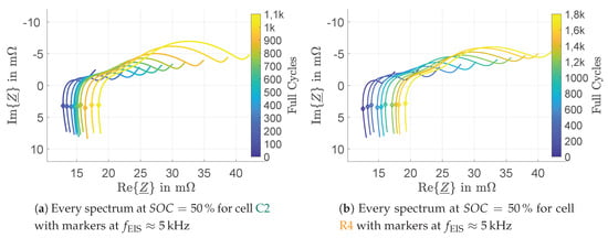 so that it is higher than the mean value which could lead to higher temperatures compared to an undistorted direct current. However, further measurements have shown that the difference in surface temperature of the cells between rippled and conventionally aged cells is below 2 K. This fits the observation that the ripple current does not have any clear influence on the dynamic battery behaviour that exceeds the influence of cyclic ageing in general. The advantage of the DRT that the most influential processes at the electrodes are visible separately further supports the aforementioned claim as no clear deviation between the cell groups is visible for any kind of diffusion or reaction process. Moreover, no direct connection between ripple current and the outliers, visible in Figure 7a–d, respectively could be found. It is expected that these cells represent the unpredictable spread that occurs in later parts of battery ageing [27]. To conclude, the spectra are used as a further possible explanation as to why the ripple does not have any severe impact. The assumption, e.g., in [14,16], that the excitation frequency of the current ripple, i.e., the switching frequency of the DC/DC-converter, has the highest impact on the dynamic behaviour of the battery if it is still in its capacitive range and thus provoking unwanted reactions at the electrodes could be another explanation for the lack of impact of high frequency current ripple on battery ageing. Switching frequencies of practical DC/DC-converters are typically located at several kilohertz which usually corresponds to the inductive branch of the battery as illustrated in Figure 9. In these drawings, the trends over ageing of the impedance spectra of two arbitrarily chosen batteries C2 and R4 with and without ripple current are depicted. Moreover, an excitation frequency of that is also the switching frequency of the converter is marked for each spectrum. Neither does the mark change position significantly nor does the inductive branch show any clear alteration because of ageing. As stated by [35,36], the inductive branch is mostly affected by the geometry of the cell and the current collectors which does not change due to cyclic ageing not to mention current ripple.
