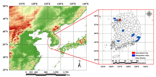 The study site is located between 33~43°N and 124~131°E in the middle latitudes of the Northern Hemisphere. Since this study site lies in the southern part of the Korean Peninsula belonging to the east coast of the Eurasian Continent and also facing the Western Pacific, it shows both continental and oceanic climate features. The average annual precipitation is 1237.4 mm from 1912 to 2017 over the entire study site, and more than half of the annual amount is concentrated in the wet season from June to September [31]. It is due to a rainy period of the East Asian Monsoon in summer and several typhoons during summer and early autumn. Severe rainstorms and typhoons have brought flooding to some areas every year, leading to serious annual storm damage to people and property in the study site (see Table 2 and Figure 3 for details). The average winter temperature is 1.2 °C, and the average precipitation amount is 94.1 mm from 1912 to 2017 [31]. There is little snow accumulation outside of mountainous regions. With mountain areas being about 70% of the country’s terrain and the high growth of urban areas through the rapidly industrializing economy and agrarian transition, the population and infrastructure tend to be concentrated in large cities, such as the Seoul Special City, the largest (605.2 km2) and capital, and the six metropolises including Busan, Incheon, Daegu, Daejeon, Gwangju, and Ulsan as denoted in Figure 1.