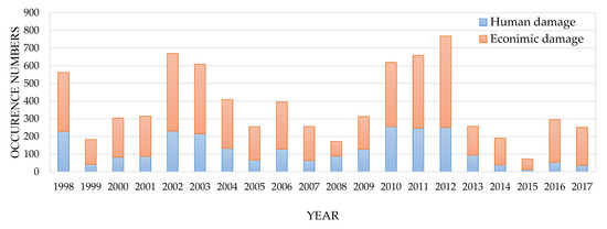 Yearly changes in the number of occurrence records of storm-induced human and economic damage cases over the nationwide 231 administrative districts from 1998 to 2017.