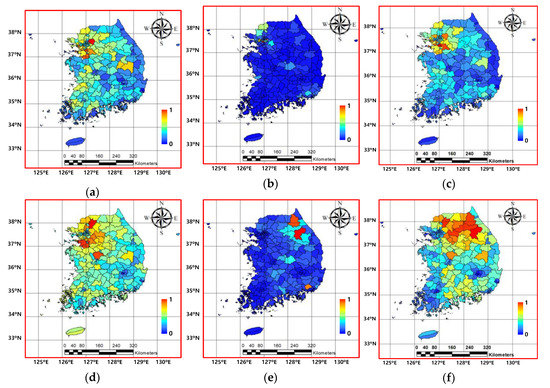 Spatial distributions of the potential components for the damage vulnerability index over the whole study site: (a) the potential of human factor ; (b) the potential of physical factor ; and (c) the potential indicator , and over the zoomed-in area around the Seoul Special City: (d) ; (e) ; and (f) .