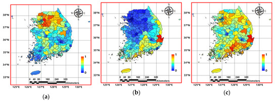 Figure 7 presents the spatial distributions over the study site of the three risk indicators , , and induced by rainstorms, typhoons, and both rainstorms and typhoons, respectively, which were calculated by Equation (6) for averaging the human and economic damage risks based on the past damage costs from 1998 to 2017. The average of the in Figure 4c and the in Figure 4f produced the rainstorm-induced risk indicator that has higher values mostly in the northern districts and comparable high values in some southern inland districts (Figure 7a). As denoted in Figure 7b, the typhoon-induced risk indicator averaged by the in Figure 5c and the in Figure 5f produced the top-level values in the two coastal districts of the southeastern part and comparable high values, mostly in the southern and eastern districts near the coastline located on the typical routes of severe typhoons. Figure 7c presents the risk indicator induced by both the two main causes of rainstorms and typhoons, as an average of the in Figure 6c and the in Figure 6f. The produced the highest-level values in some southern and eastern districts influenced largely by typhoons and comparable high outcomes in some northern districts including suburban areas of the Seoul Special City influenced largely by rainstorms. Such a spatial pattern of the supports the fact that the typhoon-induced damage risk could be more serious than the rainstorm-induced damage risk in this study site.