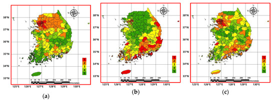 Figure 8 indicates the damage vulnerability assessment results classified into the five grades from Level 1 for the highest and to Level 5 for the lowest at equal intervals of the ranking orders based on the outcomes by Equation (7). As denoted Figure 8a, the damage vulnerability to rainstorms was graded at Level 1 around the Seoul Special City and its vicinities located in the northwestern part and Busan metropolis located in the southeastern part. Most of the northern administrative districts were assessed as comparably vulnerable regions to rainstorm-induced damage at Level 2. Figure 8b presents a higher level (Level 1 or 2) vulnerability to typhoon-induced damage in some administrative districts of the Seoul metropolitan areas that have the highest-level potential components and most administrative districts along southern and eastern coastlines on the typical tracks of typhoons in the study site. Figure 8c indicates the higher level grades (Level 1 or 2) of the damage vulnerability to both rainstorms and typhoons in Seoul and Busan metropolises mainly due to higher potential components, and the Seoul’s vicinities and some southern districts mainly due to higher risk components. As shown in Figure 8, the vulnerable districts were assessed differently according to the causes of the disaster damage, but some administrative districts in Seoul (northwestern part) and Busan (southeastern part) metropolises were found to have the top-level vulnerability for all the three cases.