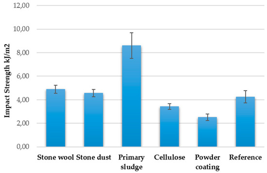 The impact strength values of the composites in Figure 4 were quite alike except for the primary sludge, which clearly had better impact strength values than the other materials. However, the standard deviation of values for the sludge composite samples was quite large, but the result was still better than with the other composites. Huang et al. [24] found that paper mill sludge improved the impact strength. Lahtela et al. [12] also found that sludge improved the impact strength compared to a filler from wood flour. Migneault et al. [28] came to the same conclusion while comparing wood fibers and different pulps from a paper mill, and Keskisaari and Kärki [29] noted that carton cutting waste improved the properties of the composites. Väntsi et al. [16] found that mineral wool slightly increased the impact strength of a composite like the one in this study. Keskisaari et al. [30] also found that adding mineral wool to a composite increased impact strength. Huuhilo et al. [23] discovered that a mineral filler usually improved the impact strength of a wood–polymer composite (WPC), except in the case of talc. Mishra et al. [31] found that adding glass fiber to bio-based fiber composites increased the impact strength.
