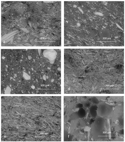 Scanning electron microscope micrographs at 150× magnification for (a) reference composite, (b) stone wool, (c) stone dust, (d) primary sludge, (e) cellulose, and (f) powder coating.