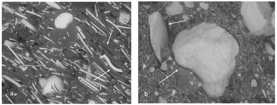 SEM figures confirmed the above, as the results in Figure 5 show. In Figure 5b, the filler is shown in fibrous form, and, in Figure 5c, it is shown in cubical form. In both cases, it can be seen that the filler was not fully connected to the matrix. This can be seen more clearly in Figure 6a,b. In Figure 6, the arrows show the poor coupling. In Figure 6a, there are slots from the fiber where the material was torn apart. The arrows also show that there were gaps between the matrix and fiber. Figure 6b shows that there were gaps between the matrix and filler, as shown by the arrows. Due to the poor interfacial adhesion of the filler and the matrix, the mechanical properties of the composite declined. The composites in Figure 5d,e seemed similarly smooth, but there was a clear difference between them in terms of impact and tensile strength values. Nothing in these figures could explain the difference. Compared to the reference material, where the wood material was wood flour, the composites made from paper mill waste looked smoother due to the different size of the fiber particles. The sample in Figure 5f differed from the other composites. As can be seen from the figure, the composite appeared to be full of cavities. This explains its weak tensile properties and low density. It also seems that fine particles attached to the fiber materials. If this coating of fibers prevents matrix adhesion to the fiber materials, it might explain the poor mechanical properties of the composites. The cavities formed during extrusion, presumably due to the incompatibility between HDPE and polyester and the vaporization of water. Although the mechanical properties of the powder coating composite were weak, one factor has to be taken into account. The density of the material was very low.
