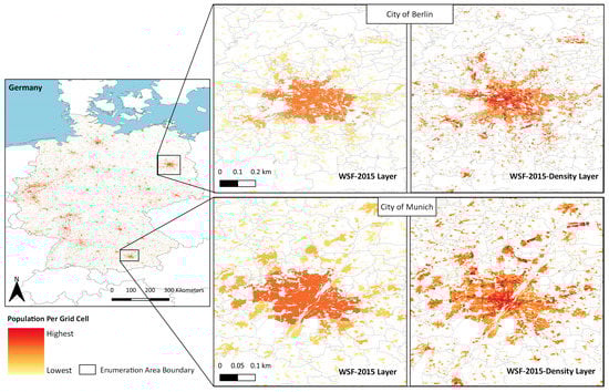 Because the volume of results (72 population distribution maps) is too large to present here in full, we focused on one representative country to visually inspect the thematic differences between the maps produced using the WSF-2015-Density and the WSF-2015 layers before turning to the quantitative analyses of all the maps. Figure 2 shows the final population distribution maps produced using the finest administrative units for Germany (enumeration areas), depicting the local metropolitan areas of Berlin and Munich. Note that, for the finest administrative units, these two areas have been modelled using a single census unit were local differences between the binary and the weighted disaggregation approaches are rather clear.