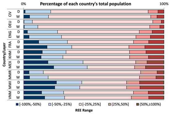 Percentage of each country’s total population that fell within each REE range. D, using the WSF-2015-Density layer; W, using the WSF-2015 layer.