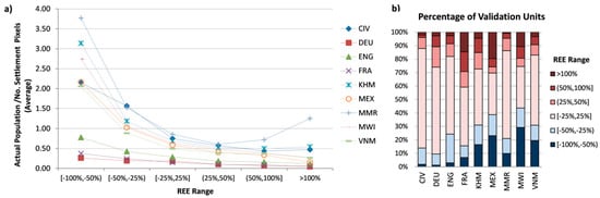 REE distribution: (a) ratio between the average population and the average number of settlement pixels for the validation units that fell within each REE range; and (b) percentage of validation units that fell within each REE range.