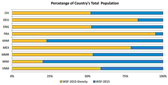 Figure 5 illustrates the percentage bar charts for each country. As one can notice, for Germany, France and Mexico, the predominance of the WSF-2015-Density is clear, distributing more than 75% of each country’s total population with overall lower RMSE values in comparison to the WSF-2015 layer. On the other hand, for Cambodia and Malawi, the WSF-2015 layer performs better, distributing more than 75% of the population more accurately compared to WSF-2015-Density layer. In the rest of the countries (i.e., Côte d’ Ivoire, England, Myanmar and Vietnam), both layers perform equally, with the WSF-2015-Density layer distributing a slightly larger amount of the population better than the WSF-2015 layer.