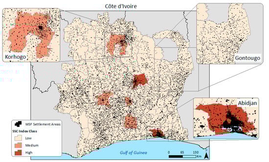 To identify the regions where each covariate layer produced higher accuracies, the input units of each country were classified according to the SSC index (Equation (7), Table 5). The map in Figure 6 illustrates the results of this classification for Côte d’ Ivoire. Here, most of the input units fell within the “low” SSC class, which is characterised by small size settlement objects that cover a low percentage of each input unit’s total area. A few input units fell within the “medium” SSC class, characterised by a mix of medium and small size settlements objects, and only two input units fell within the “high” SSC class, characterised by large size settlement objects that cover a large extent of each input unit’s total area. For Côte d’ Ivoire, some of the most populated cities are located within the “high” and “medium” input units, such as Abidjan, Bouake, Korhogo and Divo.