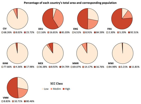 Following this classification, the same analysis was carried out for each country. Figure 7 shows the percentage of each country’s total area (pie charts) and corresponding population (boxes) derived from the input units according to the SSC index.