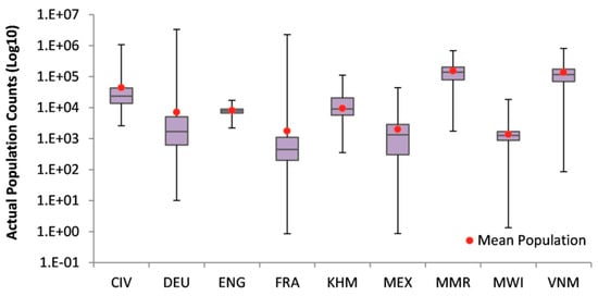 Boxplots of the distribution of the actual population counts of the validation units for each country with the inter-quartile range demarcated by the purple box.