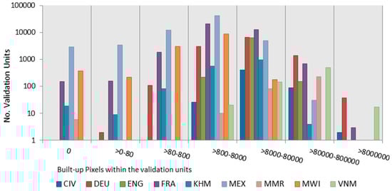 We attribute these errors to the quality (completeness) of the covariate layers and to the fact that they do not take into account information on the land or building use. On the one hand, our findings indicate that errors of underestimation are reported in validation units where not enough settlement pixels have been found for population disaggregation. These errors increase as the ratio between the actual population and the number of settlement pixels increases (Figure 4a). This means, for example, that, in countries where a large percentage of the population and validation units were “greatly underestimated” (Table 7 and Figure 4b), such as France, Cambodia, Mexico and Malawi, this can be explained by the large amount of validation units where zero or very few settlement pixels have been identified (Figure 10). Therefore, despite the fact that the thematic accuracy of the WSF-2015 layer clearly outperforms any of the currently existing global human settlements masks [43], it is clear the data still show limitations with respect to a complete detection of all building structures. This can be explained by the spatial resolution of the Sentinel-1 and Landsat imagery used as input data, which restricts the identification of building structures, especially in regions where the settlement pattern is characterised by wide-spread single houses or very small hamlets.