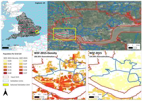On the other hand, errors of overestimation are reported in validation units where a large number of settlement pixels have been reported in comparison to the amount of actual population, and that they increase as the ration between these two parameters decreases (Figure 4a). After a visual analysis of VHR satellite imagery, we found that large errors of overestimation are mainly reported in validation units where seaports and industrial complexes exist. Figure 11 shows an example of the population distribution results for an input unit in England with this particular built-up environment. The red line represents the geographical boundary of the input unit used for population disaggregation and the blue lines represent the geographical boundaries of the validation units. Here, it is possible to observe industrial areas in the southern parts of the input unit. These areas capture a large amount of the population counts comparable to high-density residential areas, reporting large errors of overestimation in the validation units. In the selected validation unit, for example the WSF-2015-Density layer reported a higher REE (186.56%) in comparison to the WSF-2015 (154.49%). This does not mean, however, that in every validation unit where this built-up environment exists the binary layer will perform better than the impervious layer. Depending on the extent and geographical boundaries of the input units, industrial or port areas can be mixed with residential areas, influencing the performance of each layer. More detailed information on and discussion of this aspect is provided at the end of this section in the context of the SSC index.
